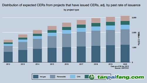 盡管歐盟從2013年4月起全面禁止HFC-23等特定工業(yè)氣體減排量進(jìn)入EU ETS,同時(shí)規(guī)定2013年之前產(chǎn)生的未使用國際碳信用在今年履約后將不能再使用,但目前已經(jīng)在CDM EB注冊的7635個(gè)CDM項(xiàng)目中仍有很大的供給潛力,導(dǎo)致國際碳信用供需仍然不平衡。根據(jù)UNFCCC網(wǎng)站的預(yù)測,僅預(yù)測已經(jīng)簽發(fā)的2,584個(gè)項(xiàng)目在2020年前的可簽發(fā)量就超過30億噸,如下圖所示,其中來源可再生能源項(xiàng)目的CER增長明顯。若加上未簽發(fā)項(xiàng)目,潛在的供應(yīng)量更加驚人。 本%文$內(nèi)-容-來-自;中_國_碳|排 放_(tái)交-易^網(wǎng)^t an pa i fang . c om