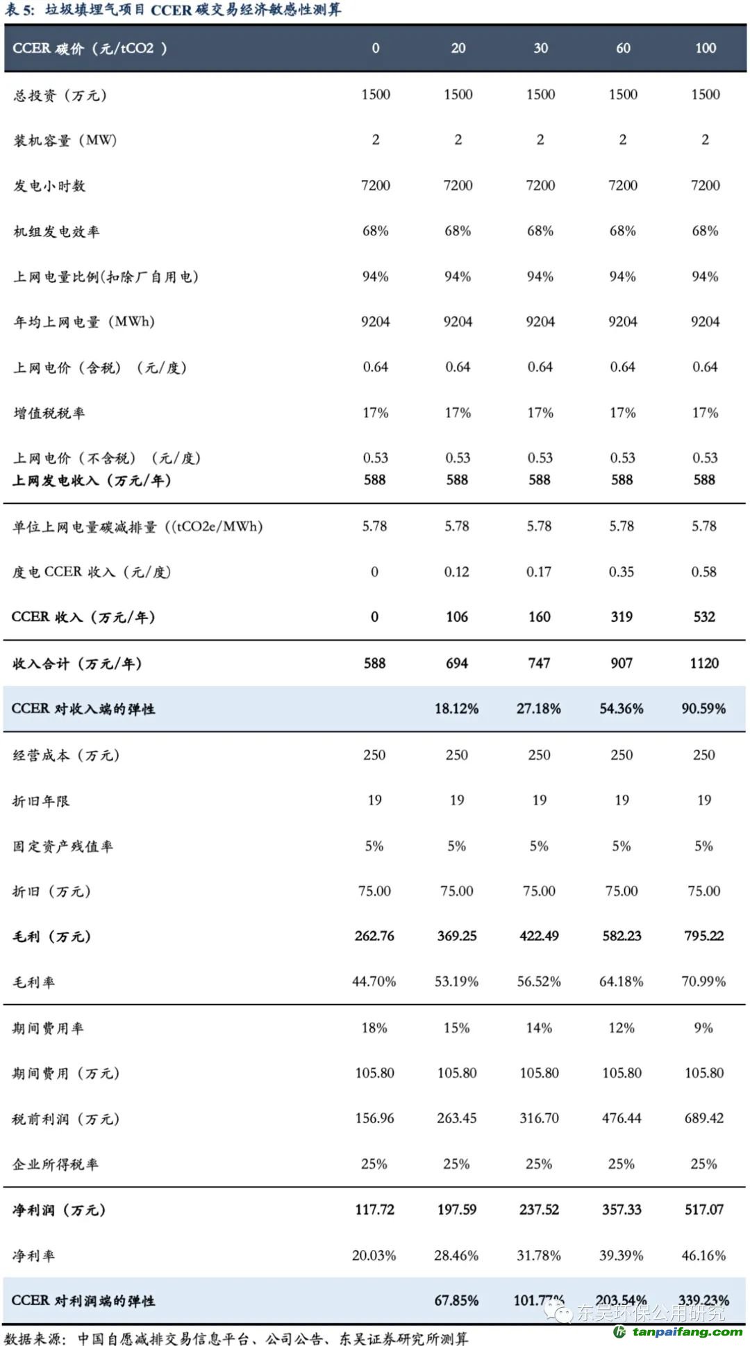 填埋氣資源化減碳經(jīng)濟效益測算:CCER碳價 30元情景下,度電CCER收入達0.17元,對填埋氣資源化項目收入端彈性達27.18%,利潤端彈性達101.77%,凈利率提升11.75pct至31.78%;CCER碳價 60元情景下,度電CCER收入將提升至0.35元,收入端彈性增至54.36%,利潤端彈性增至203.54%,凈利率提升19.36pct至39.39%。 本`文@內(nèi)/容/來/自:中-國^碳-排-放^*交*易^網(wǎng)-tan pai fang. com