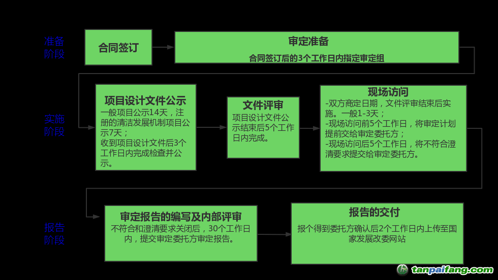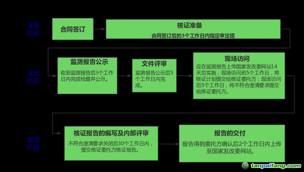 核證機(jī)構(gòu)應(yīng)按照規(guī)定的程序進(jìn)行核證,主要步驟包括合同簽訂、核證準(zhǔn)備、監(jiān)測(cè)報(bào)告公示、文件評(píng)審、現(xiàn)場(chǎng)訪問(wèn)、核證報(bào)告的編寫及內(nèi)部評(píng)審、核證報(bào)告的交付等7 個(gè)步驟,具體的審定工作程序?yàn)椋?本+文+內(nèi).容.來(lái).自:中`國(guó)`碳`排*放*交*易^網(wǎng) t a np ai fan g.com
