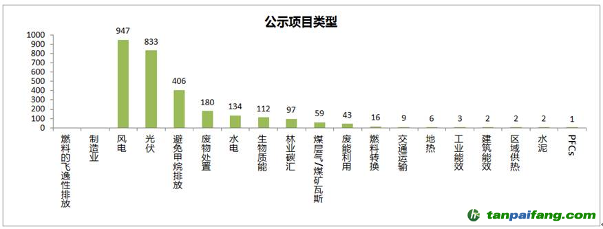 截止到2017年3月,累計公示CCER審定項(xiàng)目2,852個,項(xiàng)目備案的網(wǎng)站記錄861個;減排量備案的網(wǎng)站記錄254個,實(shí)際減排量備案項(xiàng)目為234個(有20個項(xiàng)目減排量至少備案一次,屬于項(xiàng)目記錄重復(fù))就公示項(xiàng)目類型而言,以可再生能源居多,共計2032個,占公示項(xiàng)目總數(shù)的71%,其中:風(fēng)電947個、光伏833個、水電134個、生物質(zhì)能112個、地?zé)?個。其次是避免甲烷排放類項(xiàng)目,共計406個,占公示項(xiàng)目總數(shù)的14%;再次是廢物處置類項(xiàng)目,共計180個,占公示項(xiàng)目總數(shù)的6%。 本*文`內(nèi)/容/來/自:中-國-碳^排-放“交|易^網(wǎng)-tan pai fang . c o m