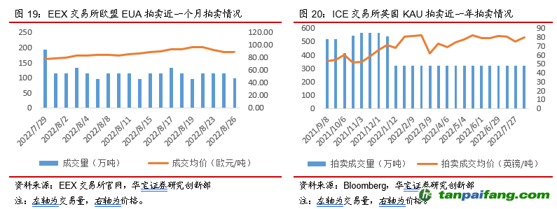 本周(8月22日-8月28日)國外碳配額二級(jí)市場價(jià)格漲跌不一,但成交量均有所上漲。歐盟本周一級(jí)市場拍賣量442.15萬噸,同比下降22.98%,拍賣周均價(jià)92.32歐元/噸,相比上周的周均價(jià)下浮0.66%,根據(jù)EEX官網(wǎng)拍賣日歷,由于2022年9月單次拍賣量將回歸正常,相比8月單次拍賣量有所回升,故碳價(jià)下跌。歐盟二級(jí)市場EUA總成交量小幅上漲2.03%,本周平均碳價(jià)有所回調(diào),在90歐元/噸左右徘徊,期現(xiàn)貨價(jià)格分別同比下降4.72%、5.58%,周內(nèi)期現(xiàn)貨碳價(jià)呈U型走勢(shì)。本周英國二級(jí)市場本周UKA期現(xiàn)貨成交量分別上漲101.92%、625.39%,現(xiàn)貨成交均價(jià)下跌1.01%,期貨成交均價(jià)上漲0.08%。韓國市場本周KAU22現(xiàn)貨成交量大幅增加,合計(jì)成交量24.05萬噸,同比上升200.88%,平均碳價(jià)略有下跌,跌幅為0.53%。 本+文`內(nèi).容.來.自:中`國`碳`排*放*交*易^網(wǎng) t a np ai fan g.com