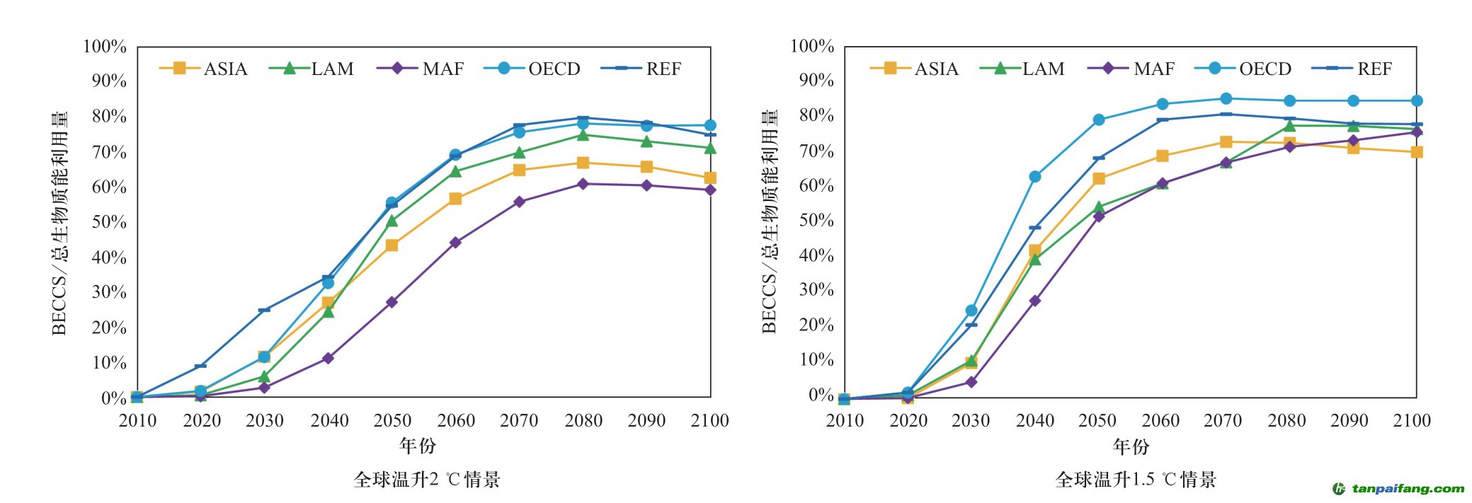 由于BECCS僅考慮了生物質(zhì)能利用中適于結(jié)合CCS的技術(shù)路徑,因而一般其利用量會低于生物質(zhì)能的利用量。全球溫升2 ℃情景下,生物質(zhì)能中BECCS的比重在2030年開始快速增加,各區(qū)域從2030年占比2.7%~24.55%,到2050年增加到26.96%~55.33%。從2070年開始各區(qū)域的BECCS占生物質(zhì)能的比重穩(wěn)定在60%~80%(見圖10)。不同區(qū)域的BECCS在該區(qū)域總生物質(zhì)能利用量中的占比也有差別,2020—2100年的大部分時(shí)間里OECD是占比最大的區(qū)域,而MAF是占比最小的區(qū)域。全球溫升1.5 ℃情景下,BECCS在生物質(zhì)能中的比重也在2030年開始迅速增加。與2 ℃溫升相比,1.5 ℃情景下BECCS在生物質(zhì)能中的比重更早趨于穩(wěn)定,并且比重更高。全球溫升1.5 ℃情景下,2050年各區(qū)域BECCS的比重就達(dá)到51.74%~79.15%,并且進(jìn)一步增加。到2100年,BECCS在生物質(zhì)能利用中的比重最高的OECD區(qū)域?qū)⑦_(dá)到84.52%,即使比重最低的ASIA區(qū)域也達(dá)到70.01%。 內(nèi)-容-來-自;中_國_碳_0排放¥交-易=網(wǎng) t an pa i fa ng . c om