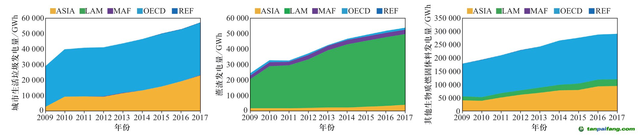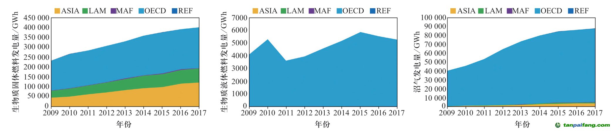 高效的生物質(zhì)能利用方式中,生物質(zhì)發(fā)電是其主要的利用方式之一。根據(jù)2019年IRENA的統(tǒng)計(jì)結(jié)果[8],2017年全球生物質(zhì)發(fā)電量達(dá)到495 395 GWh,相比于2009年增加了218 335 GWh。OECD區(qū)域是生物質(zhì)發(fā)電量最大的地區(qū),2017年OECD區(qū)域生物質(zhì)發(fā)電量達(dá)到291 214 GWh,其中生物質(zhì)固體燃料占70.05%,液體生物質(zhì)燃料占1.80%,沼氣發(fā)電占28.15%。ASIA區(qū)域、LAM區(qū)域和MAF區(qū)域主要是生物質(zhì)固體燃料發(fā)電,2017年ASIA區(qū)域生物質(zhì)發(fā)電達(dá)到126 718 GWh,其中生物質(zhì)固體燃料發(fā)電占96.74%,沼氣發(fā)電占3.26%。LAM區(qū)域和MAF區(qū)域2017年生物質(zhì)發(fā)電分別為72 112 GWh和3453 GWh,其中生物質(zhì)固體燃料發(fā)電分別占98.21%和89.34%。REF區(qū)域的生物質(zhì)發(fā)電量最小,2017年生物質(zhì)發(fā)電量為663 GWh,主要是生物質(zhì)固體燃料和沼氣發(fā)電,分別占70.23%和29.77%(見圖2)。 本*文`內(nèi)/容/來/自:中-國-碳^排-放“交|易^網(wǎng)-tan pai fang . c o m
