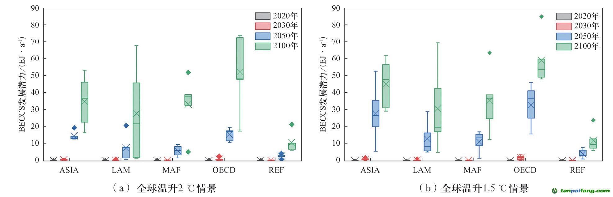本研究基于全球情景研究結(jié)果,結(jié)合全球各區(qū)域生物質(zhì)資源利用現(xiàn)狀、生物質(zhì)能潛力與碳封存潛力,評估分析了全球溫升2 ℃和1.5 ℃情景下主要區(qū)域的BECCS發(fā)展?jié)摿Α8鲄^(qū)域BECCS從2030年到2050年開始快速發(fā)展。全球溫升2 ℃情景下,主要以生物質(zhì)發(fā)電和生物質(zhì)液體燃料結(jié)合CCS為主,而生物質(zhì)制氫結(jié)合CCS的發(fā)展?jié)摿^小,但是在溫升1.5 ℃情景下,生物質(zhì)制氫結(jié)合CCS相對于2 ℃溫升情景的增加量較大。分區(qū)域來看,OECD和ASIA區(qū)域是BECCS發(fā)展?jié)摿ψ畲蟮膬蓚€(gè)區(qū)域,其次是MAF和LAM區(qū)域,而REF區(qū)域的BECCS發(fā)展?jié)摿ψ钚?。BECCS在生物質(zhì)能利用的比重上,OECD區(qū)域是比重最大的地區(qū),而MAF區(qū)域是比重最小的地區(qū)。到本世紀(jì)末,全球溫升2 ℃和1.5 ℃情景下各區(qū)域的BECCS在生物質(zhì)能利用中的比重都超過了50%。 夲呅內(nèi)傛萊源?。骇鎲┨?排*放^鮫*易-網(wǎng) τā ńpāīfāńɡ.cōm