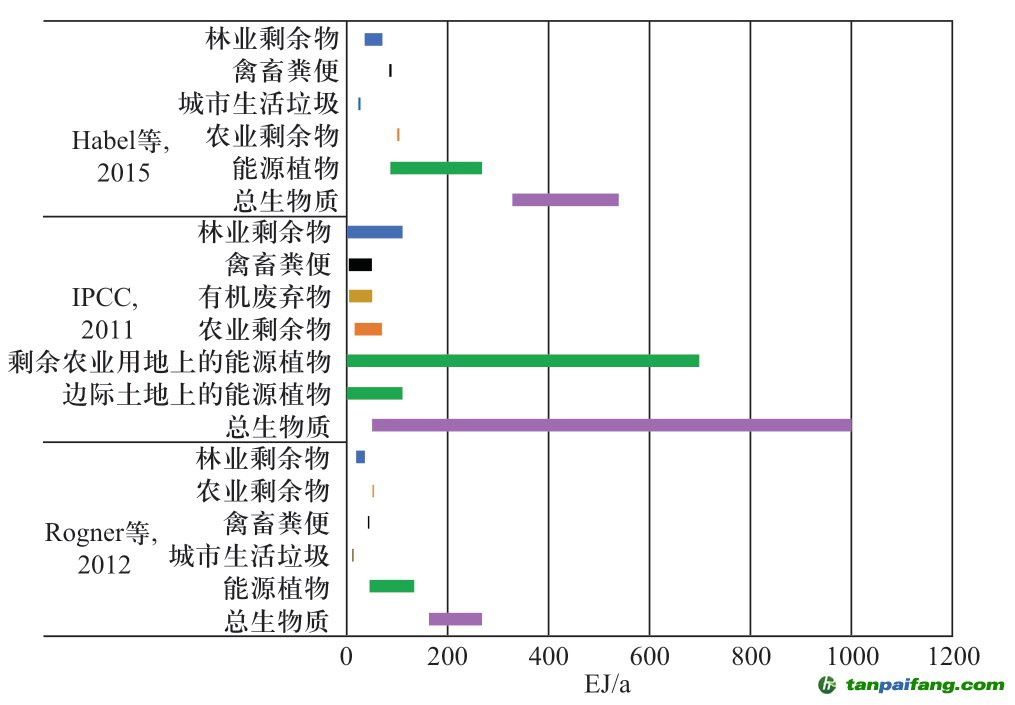 考慮到生物質(zhì)能可利用條件的限制,IPCC于2011年預(yù)計(jì)到2050年全球可用于能源化利用的生物質(zhì)潛在推廣利用水平為100~300 EJ/a[5] 。