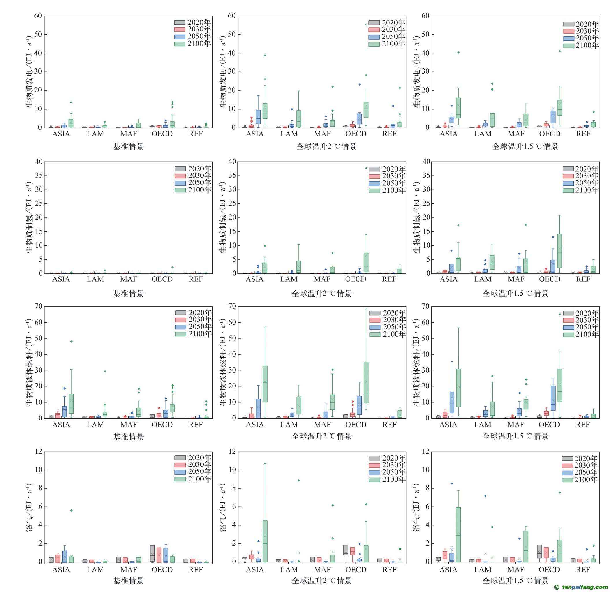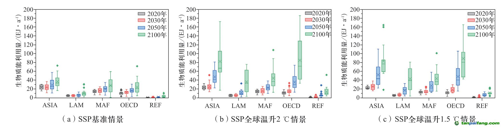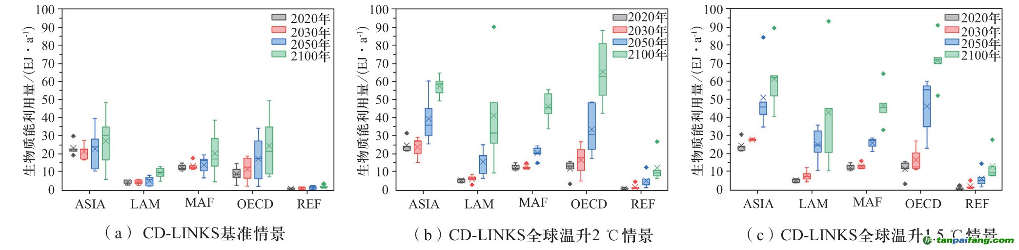 SSP數(shù)據(jù)庫中,全球各區(qū)域的生物質(zhì)能利用量將逐步增加。基準(zhǔn)情景下(見圖4(a)),ASIA、MAF和OECD區(qū)域是發(fā)展較快的地區(qū),從2020年到2100年,這三個(gè)區(qū)域的平均生物質(zhì)能利用量分別增加了12.98 EJ/a、13.64 EJ/a和14.06 EJ/a。相對而言,LAM和REF區(qū)域分別增加了5.75 EJ/a和2.58 EJ/a。當(dāng)考慮全球溫升目標(biāo)的影響時(shí),各區(qū)域的生物質(zhì)能利用量相比基準(zhǔn)情景都明顯增加(見圖4(b))。在全球溫升2 ℃情景下,ASIA和OECD區(qū)域的平均生物質(zhì)能利用量在2020年到2100年期間分別增加了58.34 EJ/a和73.47 EJ/a,而LAM、MAF和REF區(qū)域分別增加了30.74 EJ/a、30.27 EJ/a和12.74 EJ/a。而考慮更為嚴(yán)格的溫升目標(biāo)時(shí),全球溫升1.5 ℃情景下各區(qū)域的生物質(zhì)能利用量相對于全球溫升2 ℃情景增加的相當(dāng)有限(見圖4(c)),結(jié)合各區(qū)域的生物質(zhì)資源潛力,預(yù)計(jì)當(dāng)生物質(zhì)能的利用量達(dá)到較高水平時(shí),將更多受制于土地、淡水、糧食安全等上限約束。 本`文@內(nèi)/容/來/自:中-國^碳-排-放^*交*易^網(wǎng)-tan pai fang. com