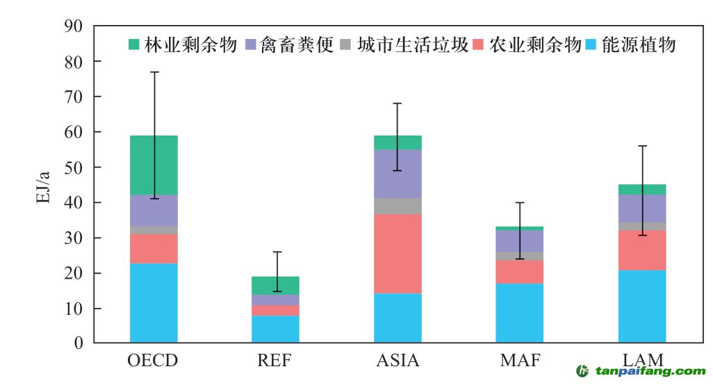 各區(qū)域的生物質(zhì)能潛力也有較大差別。Haberl 等在2010年評估了世界主要區(qū)域的生物質(zhì)能技術(shù)潛力(見圖12),其研究結(jié)果表明2050年OECD區(qū)域的生物質(zhì)資源技術(shù)潛力達(dá)到了59 EJ/a,其中林業(yè)剩余物和能源植物占比最大,分別為23 EJ/a和17 EJ/a。ASIA地區(qū)的總生物質(zhì)能技術(shù)潛力為59 EJ/a,其中農(nóng)業(yè)剩余物占比最大,達(dá)到23 EJ/a。REF、MAF和LAM區(qū)域的生物質(zhì)能技術(shù)潛力也分別達(dá)到19 EJ/a、33 EJ/a和45 EJ/a[20]。各區(qū)域的生物質(zhì)能潛力的不確定范圍也較大,主要以能源植物和林業(yè)剩余物的不確定為主,其中以O(shè)ECD的不確定范圍最大,其生物質(zhì)能技術(shù)潛力為41~77 EJ/a,REF區(qū)域的不確定范圍最小,其生物質(zhì)能技術(shù)潛力為12~23 EJ/a[20]。 內(nèi)/容/來/自:中-國/碳-排*放^交%易#網(wǎng)-tan p a i fang . com
