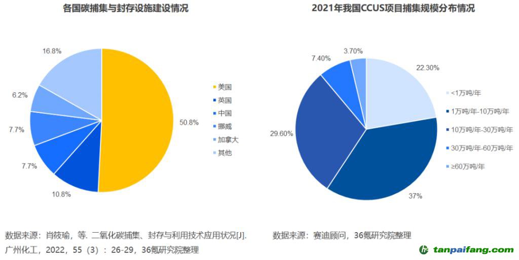 隨著國(guó)家科技重大專項(xiàng)、國(guó)家重點(diǎn)研發(fā)計(jì)劃等支持不斷,我國(guó)在 CCUS 各環(huán)節(jié)的關(guān)鍵技術(shù)不斷突破,其中,碳捕集環(huán)節(jié)的燃燒前物理吸收法、碳利用環(huán)節(jié)的鈾礦地浸開(kāi)采技術(shù)等已處于商業(yè)應(yīng)用階段。與此同時(shí),我國(guó)仍存在 CCUS 相關(guān)設(shè)施數(shù)量較少、項(xiàng)目規(guī)模較小等短板,部分關(guān)鍵技術(shù)落后于國(guó)際先進(jìn)水平。根據(jù)《二氧化碳捕集、封存與利用技術(shù)應(yīng)用狀況》數(shù)據(jù),中國(guó)已建成投產(chǎn)、在建及擬建的碳捕集與封存設(shè)施數(shù)量占全球總量的 7.7%,占比遠(yuǎn)低于美國(guó)的 50.8%。賽迪顧問(wèn)數(shù)據(jù)顯示,2021 年我國(guó)捕集規(guī)模在 30 萬(wàn)噸 / 年以下的 CCUS 項(xiàng)目數(shù)量占比達(dá) 88.9%,捕集規(guī)模超過(guò) 60 萬(wàn)噸 / 年的項(xiàng)目?jī)H占 3.7%,而美國(guó) CCUS 單項(xiàng)年均碳捕集規(guī)模約 241.4 萬(wàn)噸 / 年。 禸*嫆唻@洎:狆國(guó)湠棑倣茭昜蛧 τāńpāīfāńɡ.cōm