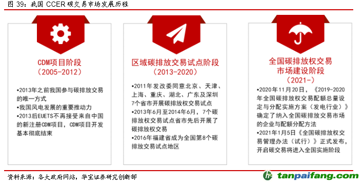 ? 第三階段:全國(guó)碳交易市場(chǎng)階段。從2021年開(kāi)始建立全國(guó)碳交易市場(chǎng),CCER申請(qǐng)有望重啟。 本`文@內(nèi)/容/來(lái)/自:中-國(guó)^碳-排-放^*交*易^網(wǎng)-tan pai fang. com