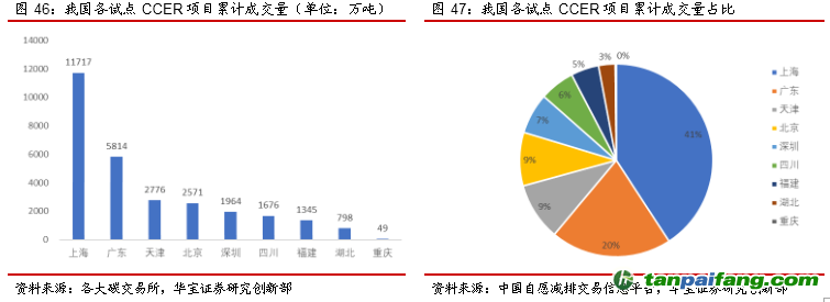 上海、廣東CCER累計(jì)成交量領(lǐng)先,占比超60%。截至2021年4月23日,中國(guó)碳市場(chǎng)CCER累計(jì)成交2.87億噸,上海、廣東CCER成交量領(lǐng)先,上海市場(chǎng)累計(jì)成交量1.17億噸,占全國(guó)累計(jì)成交量的41%,廣東市場(chǎng)累計(jì)成交量5814萬(wàn)噸,占比20%左右,北京、天津累計(jì)成交量均在2500萬(wàn)噸左右,占比分別為9%左右,深圳、四川、附件見(jiàn)累計(jì)成交量位于1300-2000萬(wàn)噸之間,占比約為5%-7%,湖北、重慶成交量較低,占比不足5%。 內(nèi)/容/來(lái)/自:中-國(guó)-碳-排-放*交…易-網(wǎng)-tan pai fang . com