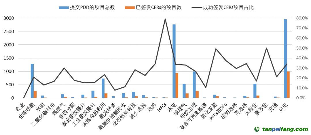 各類(lèi)型CDM項(xiàng)目CERs簽發(fā)量和占比統(tǒng)計(jì)