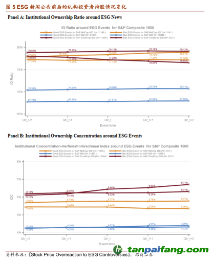 由于機(jī)構(gòu)投資者在投資決策過程中更加注重ESG問題,為了檢驗(yàn)投資者是否因?yàn)閷Υ藛栴}過度關(guān)注而忽略了基本面方面的信息,文章進(jìn)一步研究了ESG新聞公告前兩個季度到ESG新聞公告后兩個季度之間機(jī)構(gòu)投資者持股情況的變化。圖5的Panel A展示了機(jī)構(gòu)投資者持有的自由流通股比例(Institutional Ownership Ratio)的變化情況,Panel B展示了以HHI指數(shù)(Herfindahl-Hirschman index)度量的持股集中度(Institutional Ownership Concentration)的變化??梢园l(fā)現(xiàn):相比正面的ESG新聞,負(fù)面的ESG新聞公告后,機(jī)構(gòu)持股比例有所減小,即機(jī)構(gòu)投資者賣出所持股票,并且持股集中度會增加。同時與前文結(jié)論一致,小市值的股票持股變化較為明顯。對于小市值股票,平均機(jī)構(gòu)持股比例從負(fù)面ESG新聞發(fā)布前一個季度末的77.76%到后一個季度末的76.91%,而正面ESG新聞發(fā)布后的變化是從78.95%增加到79.19%,這個變化的差異很小,并且沒有統(tǒng)計學(xué)意義。這個結(jié)果可能歸因于對于S&P500指數(shù)成分股這樣大市值的股票來說,投資者更看重跟蹤誤差風(fēng)險,在面對ESG負(fù)面新聞的沖擊時,相比小市值股票,可能仍是不太愿意出售大市值股票。 內(nèi)/容/來/自:中-國-碳-排-放*交…易-網(wǎng)-tan pai fang . com