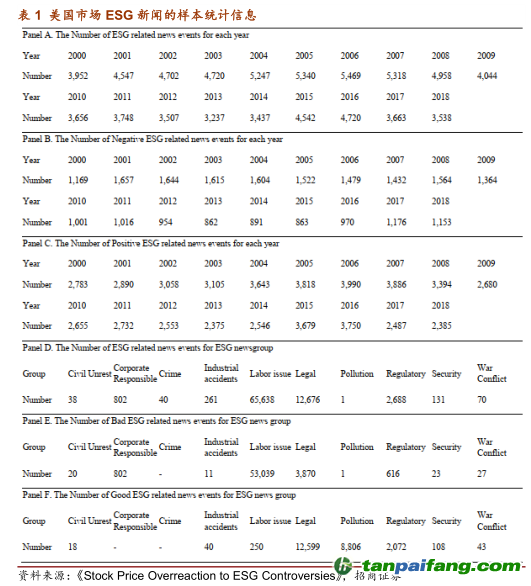 文章的最終數(shù)據(jù)樣本包括從2000年1月到2018年12月的82,435個ESG新聞事件。表1展示了樣本統(tǒng)計信息。其中,Panel A為每年的ESG新聞數(shù)量,Panel B和Panel C分別為每年負(fù)面的ESG新聞數(shù)量和正面的ESG新聞數(shù)量,Panel D、Panel E和Panel F先將ESG新聞分成十個組別:內(nèi)亂、企業(yè)責(zé)任、犯罪、工業(yè)事故、勞工問題、法律、污染、監(jiān)管機(jī)構(gòu)、安全、戰(zhàn)爭沖突,再分別統(tǒng)計了對應(yīng)組別的ESG新聞數(shù)量、負(fù)面ESG新聞數(shù)量和正面ESG新聞數(shù)量。從表1中可以看出,ESG新聞的發(fā)布在整個采樣期間分布均勻,ESG新聞中最常見的類別是勞工問題、法律和監(jiān)管機(jī)構(gòu)。