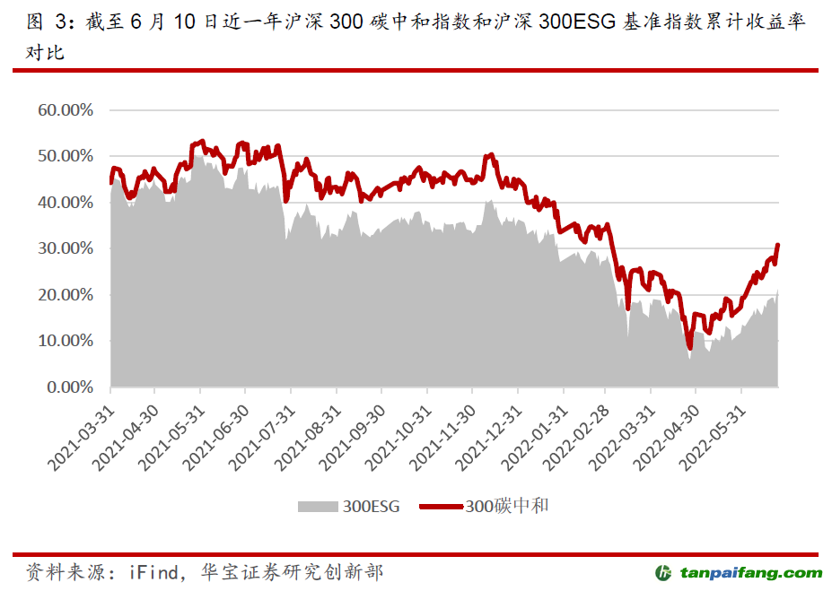 滬深300碳中和指數(shù)從滬深300指數(shù)(4444.264, 49.49, 1.13%)(4444.2639, 49.49, 1.13%)樣本中剔除中證ESG評(píng)價(jià)在B及以下的上市公司證券,選取剩余證券作為指數(shù)樣本,依據(jù)中證碳評(píng)價(jià)對指數(shù)權(quán)重進(jìn)行調(diào)整,使指數(shù)碳強(qiáng)度以逐年遞減為目標(biāo),并相對滬深300降低20%,為投資者提供以“碳中和”為目標(biāo)的綠色業(yè)績基準(zhǔn)和投資標(biāo)的。從對比中可以發(fā)現(xiàn),同時(shí)考慮了ESG和國家降碳指標(biāo)篩選出的投資組合擁有更好的累計(jì)收益率,足見ESG治理對公司發(fā)展的重要性。 本文@內(nèi)/容/來/自:中-國-碳^排-放-交易&*網(wǎng)-tan pai fang . com
