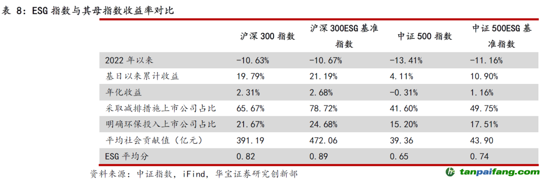截至2022年6月底,滬深300 ESG基準(zhǔn)指數(shù)、中證500ESG基準(zhǔn)指數(shù)自2017年7月(基日)以來的累計(jì)收益分別比母指數(shù)高1.40%和6.79%。其中,年初以來,中證500 ESG基準(zhǔn)指數(shù)收益為-11.16%,比中證500指數(shù)(-13.41%)高2.25%。滬深300和中證500ESG基準(zhǔn)指數(shù)最新成份股中分別有78.72%和49.75%的上市公司采取了明確碳減排措施,平均社會(huì)貢獻(xiàn)值分別為472.06億元和43.9億元,均高于滬深300和中證500指數(shù)成份股,反映了ESG基準(zhǔn)指數(shù)相對母指數(shù)在ESG方面的優(yōu)異表現(xiàn)。 本*文@內(nèi)-容-來-自;中_國_碳^排-放*交-易^網(wǎng) t an pa i fa ng . c om