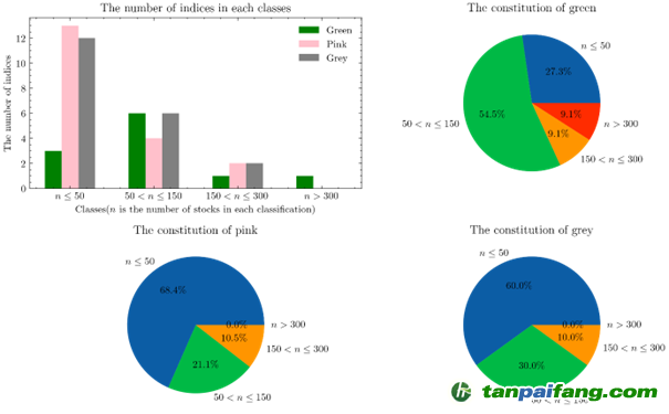 由上文聚類結(jié)果,本文進(jìn)一步統(tǒng)計(jì)出各類指數(shù)的成分股數(shù)目的特征,如圖4所展示。可以看出,位于綠色區(qū)域的指數(shù)的成分股數(shù)目普遍偏多,其涉及股票的板塊也相對更豐富,其波動率普遍偏低。而位于粉色和灰色區(qū)域的指數(shù)成分股數(shù)目的特征基本相同(由圖4下方兩幅餅圖),可能因?yàn)橹笖?shù)構(gòu)建機(jī)構(gòu)的關(guān)注點(diǎn)不同導(dǎo)致它們投資績效不同。