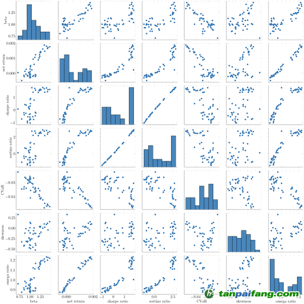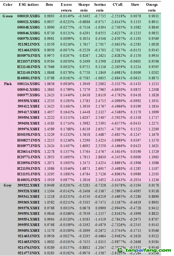 可以看出, 50只ESG指數(shù)在其基準(zhǔn)指數(shù)下的表現(xiàn)并不一致(即存在優(yōu)劣之分),在不同指標(biāo)衡量下部分的績效優(yōu)劣還會發(fā)生反轉(zhuǎn),比如000114.XSHG相比000970.XSHG夏普比率和索提諾比率更優(yōu)(數(shù)值更大),但其日收益率的偏度卻比000970.XSHG更小,也就是日收益率分布相對對稱分布而言更向左偏,更容易出現(xiàn)負(fù)收益。綜上,不同指數(shù)的投資績效有著差距,并且其差距難以使用單一指標(biāo)進(jìn)行衡量,需要綜合考慮其7種指標(biāo)績效相對于其他ESG指數(shù)績效的差值來判別其投資績效在眾多指標(biāo)的情況。 本+文+內(nèi)/容/來/自:中-國-碳-排-放(交—易^網(wǎng)-tan pai fang . com