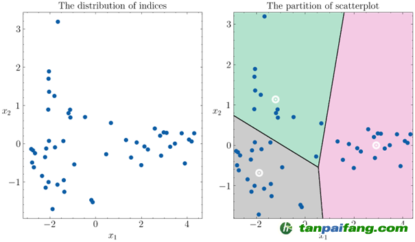 圖3左側(cè)是主成分分析降維后50只ESG指數(shù)績效的散點(diǎn)分布,可以看出它們分成三大簇聚集。于是本文選擇運(yùn)用基于歐幾里得距離的K-means算法進(jìn)行簇個(gè)數(shù)為3的聚類,生成右側(cè)的散點(diǎn)聚類示意圖,圖中的白色點(diǎn)是其所在簇的中心。 內(nèi).容.來.自:中`國*碳-排*放*交*易^網(wǎng) t a npai fa ng.com