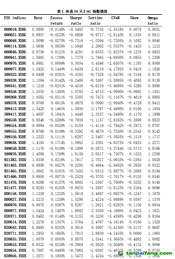 為比較不同指數(shù)篩選方法對指數(shù)投資績效的不同,需要去除基準(zhǔn)指數(shù)作為樣本空間帶來的影響,因此本文將基準(zhǔn)指數(shù)(部分指數(shù)樣本空間為全部A股,對此,本文選擇使用上證指數(shù)作為基準(zhǔn);其中全收益指數(shù)的基準(zhǔn)指數(shù)也選用全收益指數(shù))的日收益率作為當(dāng)日無風(fēng)險(xiǎn)收益率。本文所選擇的50只ESG指數(shù)和基準(zhǔn)指數(shù)行情都可以用米筐平臺(ricequant)的接口調(diào)用獲取,研究行情數(shù)據(jù)均來源于米筐平臺(下文所有的數(shù)據(jù)表中指數(shù)代碼均為米筐接口代碼)。 本%文$內(nèi)-容-來-自;中_國_碳|排 放_交-易^網(wǎng)^t an pa i fang . c om