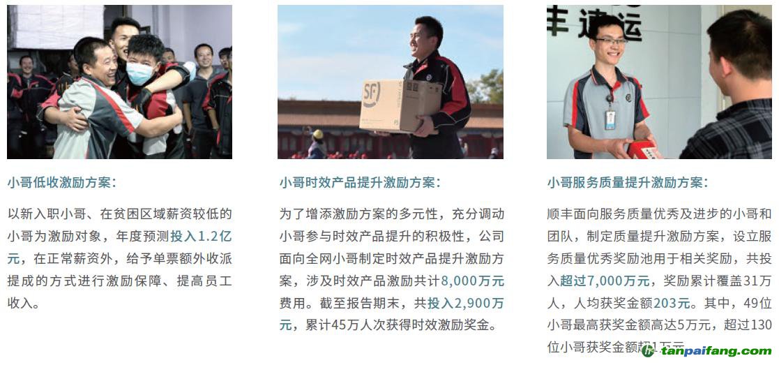 順豐積極落實(shí)國(guó)家七部委發(fā)布《關(guān)于做好快遞員群體合法權(quán)益保障工作意見(jiàn)》的號(hào)召,新增投入2億元以上專項(xiàng)資金,對(duì)服務(wù)質(zhì)量?jī)?yōu)秀、業(yè)務(wù)達(dá)成突出的員工,給予現(xiàn)金及其他形式的獎(jiǎng)勵(lì),以提升員工的收入水平。 本`文@內(nèi)-容-來(lái)-自;中^國(guó)_碳0排0放^交-易=網(wǎng) ta n pa i fa ng . co m