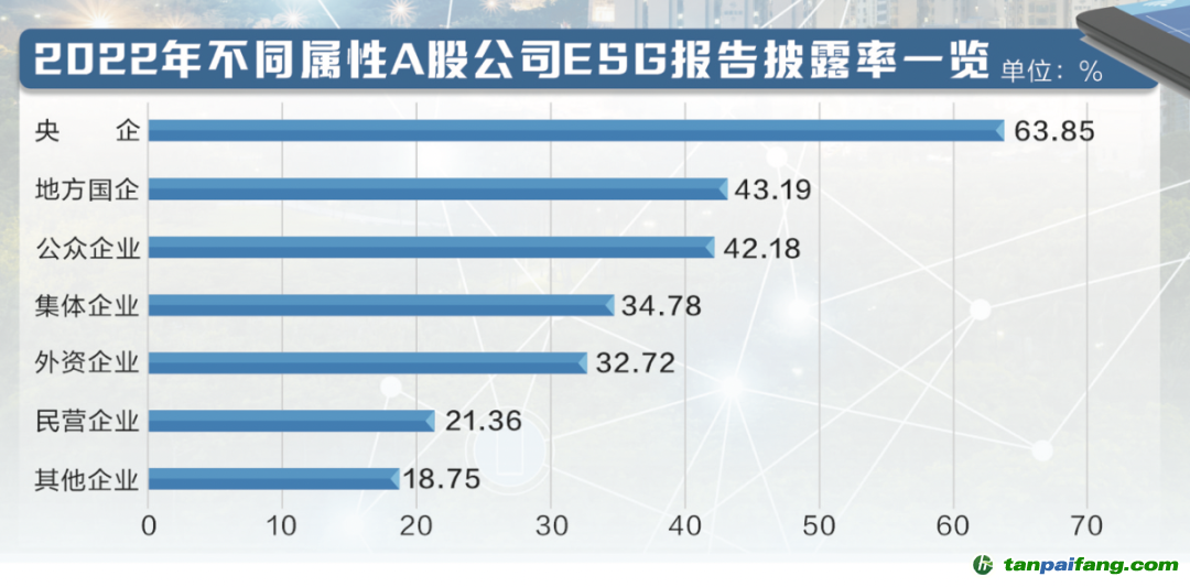 第三,國企成為ESG實踐的先鋒模范。國企ESG信息披露率優(yōu)勢明顯,其中央企的披露率近64%,較2020年提升10個百分點,地方國有企業(yè)披露率升至43%。相比之下,民營企業(yè)的披露率僅有21%左右,和國企相比差距較大。 禸*嫆唻@洎:狆國湠棑倣茭昜蛧 τāńpāīfāńɡ.cōm