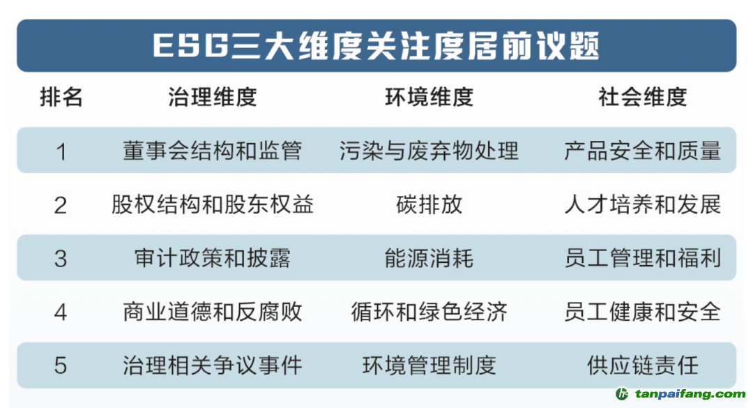 社會責(zé)任維度關(guān)注度最高的前三項依次是產(chǎn)品安全和質(zhì)量、人才培養(yǎng)和發(fā)展、員工管理和福利。這和上市公司日常經(jīng)營密切相關(guān),產(chǎn)品安全和質(zhì)量是企業(yè)生存的生命線,人才是企業(yè)創(chuàng)新發(fā)展的動力源。 本+文內(nèi).容.來.自:中`國`碳`排*放*交*易^網(wǎng) ta np ai fan g.com