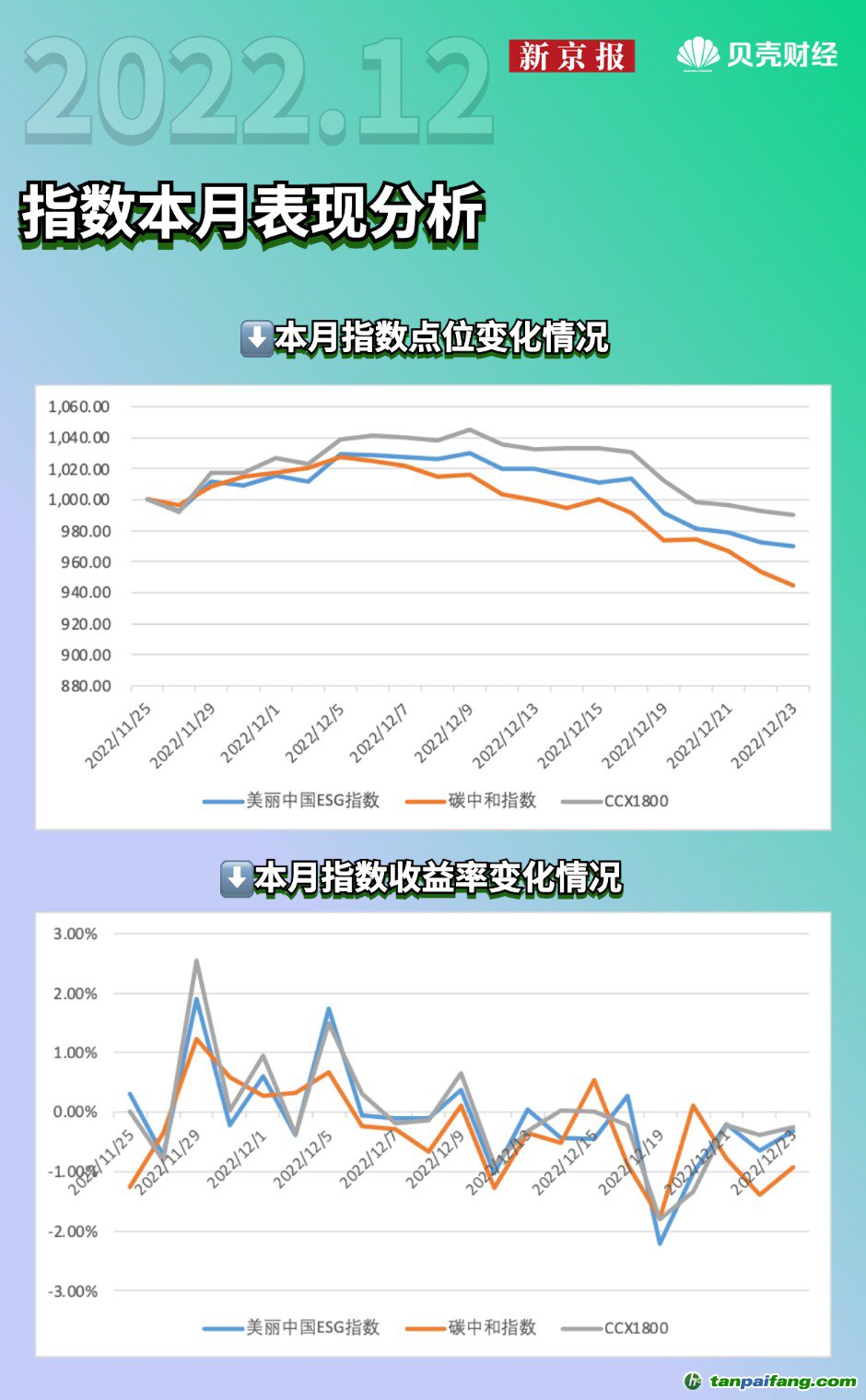 中誠信指數選取在2022年11月26日-2022年12月25日的數據,觀察貝殼財經中誠信美麗中國ESG指數與碳中和指數的表現。 本+文`內/容/來/自:中-國-碳-排-放-網-tan pai fang . com