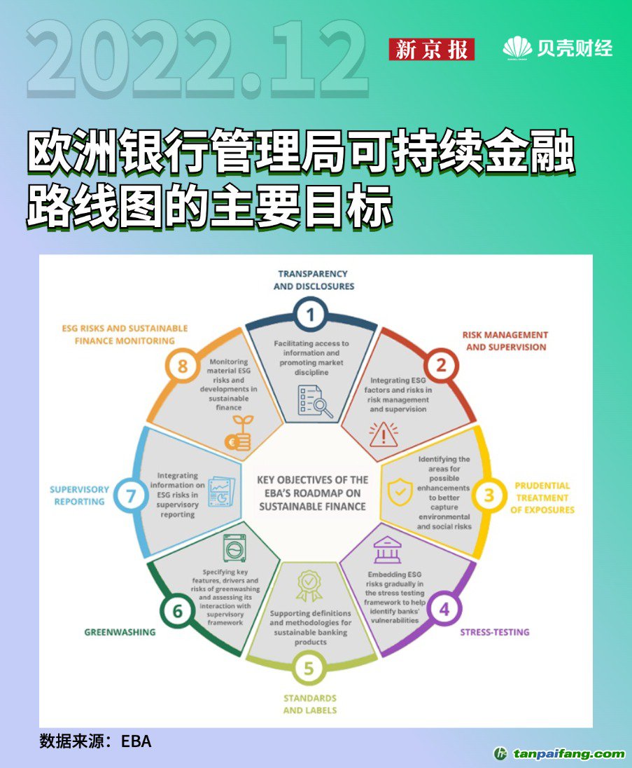 12月13日,歐洲銀行管理局EBA發(fā)布報告可持續(xù)金融路線圖,取代2019年發(fā)布的可持續(xù)金融行動計劃。這份新的可持續(xù)金融路線圖對應未來3年,將銀行業(yè)內可持續(xù)金融領域中的重要議題按優(yōu)先級和計劃作出安排,更加凸顯和強調ESG風險納入考量的監(jiān)管方向。隨著近年來的國際及歐盟地區(qū)可持續(xù)金融領域條例、法令的快速演進,歐洲銀行管理局需要與時俱進承擔起銀行業(yè)更多ESG相關風險的監(jiān)管工作,包括市場紀律、監(jiān)管、審慎要求的三大支柱,以及其他與可持續(xù)金融相關、評測監(jiān)督ESG風險。(資料來源:UK Parliament, FCA) 本+文內.容.來.自:中`國`碳`排*放*交*易^網 ta np ai fan g.com