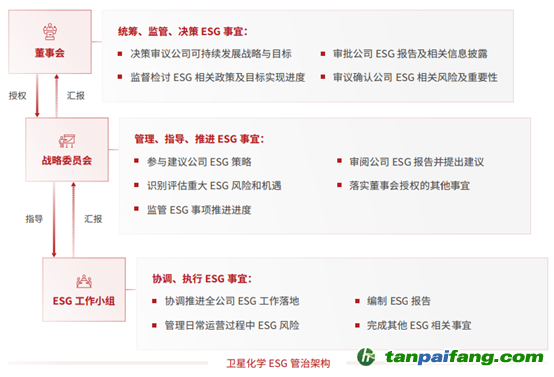 為系統(tǒng)性推進衛(wèi)星化學董事會對公司可持續(xù)發(fā)展的統(tǒng)籌監(jiān)管,提升公司全員自上而下對ESG事宜的了解和重視程度,衛(wèi)星化學搭建了由董事會、戰(zhàn)略委員會、ESG工作小組構成的ESG管治架構。ESG工作小組管理日常運營過程中ESG風險,戰(zhàn)略委員會識別評估重大ESG風險和機遇,董事會審議確認ESG相關風險及重要性。 本`文@內-容-來-自;中_國_碳排0放_交-易=網 t an pa ifa ng . c om