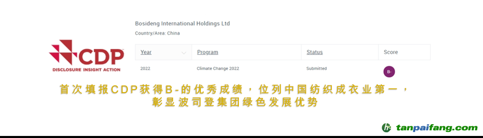 在另一項具有影響力的評級中,波司登首次填報并獲得全球環(huán)境信息研究中心(CDP)氣候變化「B-」評級,為目前(截至2023年7月)中國紡織行業(yè)獲得過的最高評級。 內(nèi).容.來.自:中`國*碳-排*放*交*易^網(wǎng) t a npai fa ng.com