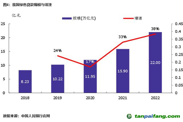根據(jù)表2可知,綠色貸款是綠色金融產(chǎn)品中規(guī)模最大的產(chǎn)品,占主要總規(guī)模的80%以上。我國(guó)綠色貸款規(guī)模為全球第一且保持快速增長(zhǎng)(如圖4所示)。截至2022年,本外幣綠色貸款余額超22萬(wàn)億元,同比增長(zhǎng)38%,高于各項(xiàng)貸款增速30.7個(gè)百分點(diǎn)。其中,投向具有直接和間接碳減排效益項(xiàng)目的貸款分別為8.32和5.56萬(wàn)億元,合計(jì)占綠色貸款的66.4%。為實(shí)現(xiàn)碳達(dá)峰、碳中和目標(biāo),預(yù)計(jì)綠色貸款規(guī)模還將持續(xù)快速增長(zhǎng)。