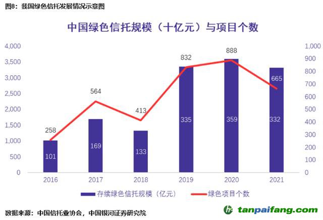 綠色信托的適用范圍很廣,未來(lái)有較大增長(zhǎng)空間。根據(jù)中國(guó)信托業(yè)協(xié)會(huì)發(fā)布的《中國(guó)信托業(yè)社會(huì)責(zé)任報(bào)告(2021-2022)》,綠色信托占全部信托資產(chǎn)規(guī)模的比例僅為1.75%,未來(lái)增長(zhǎng)空間值得期待。但是,當(dāng)下綠色信托產(chǎn)品存在不合規(guī)等問(wèn)題,正處于整頓收縮期。2021年,我國(guó)綠色信托的存續(xù)資產(chǎn)規(guī)模為3318億元,同比減少7.6%;存續(xù)項(xiàng)目數(shù)量為665個(gè),同比減少25.1%。 本+文+內(nèi)/容/來(lái)/自:中-國(guó)-碳-排-放(交—易^網(wǎng)-tan pai fang . com