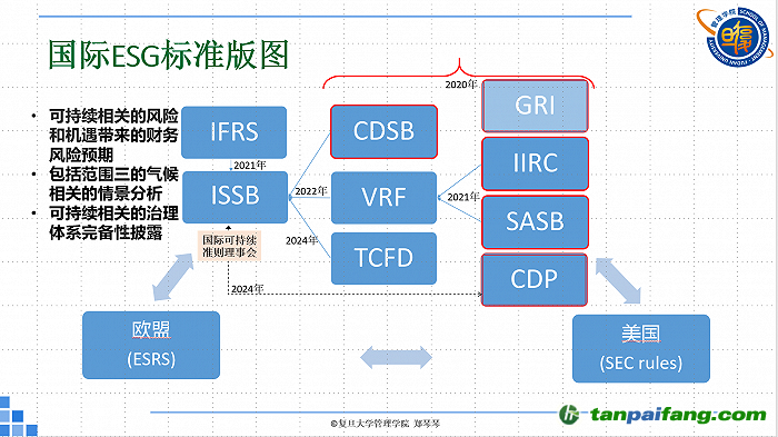 此外,在全球國際性標準確立趨于統(tǒng)一的同時,我們也會發(fā)現(xiàn)其實還有例如歐盟、美國等,他們各自在確立ESG標準過程中,都會給企業(yè)帶來一些非常重要的影響。因此國際ESG標準版圖目前大致呈現(xiàn)出三足鼎立的趨勢。