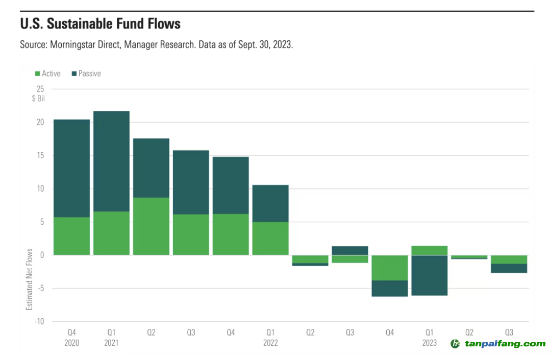 晨星公司的統(tǒng)計(jì)顯示,截至去年三季度,已經(jīng)連續(xù)第四個(gè)季度,美國(guó)ESG基金出現(xiàn)凈撤資,去年總計(jì)撤出了142億美元,整體回落至2988億美元以下,并且“與傳統(tǒng)基金相比,對(duì)ESG基金需求的減弱更為顯著”。 本@文$內(nèi).容.來.自:中`國(guó)`碳`排*放^交*易^網(wǎng) t a np ai fan g.c om