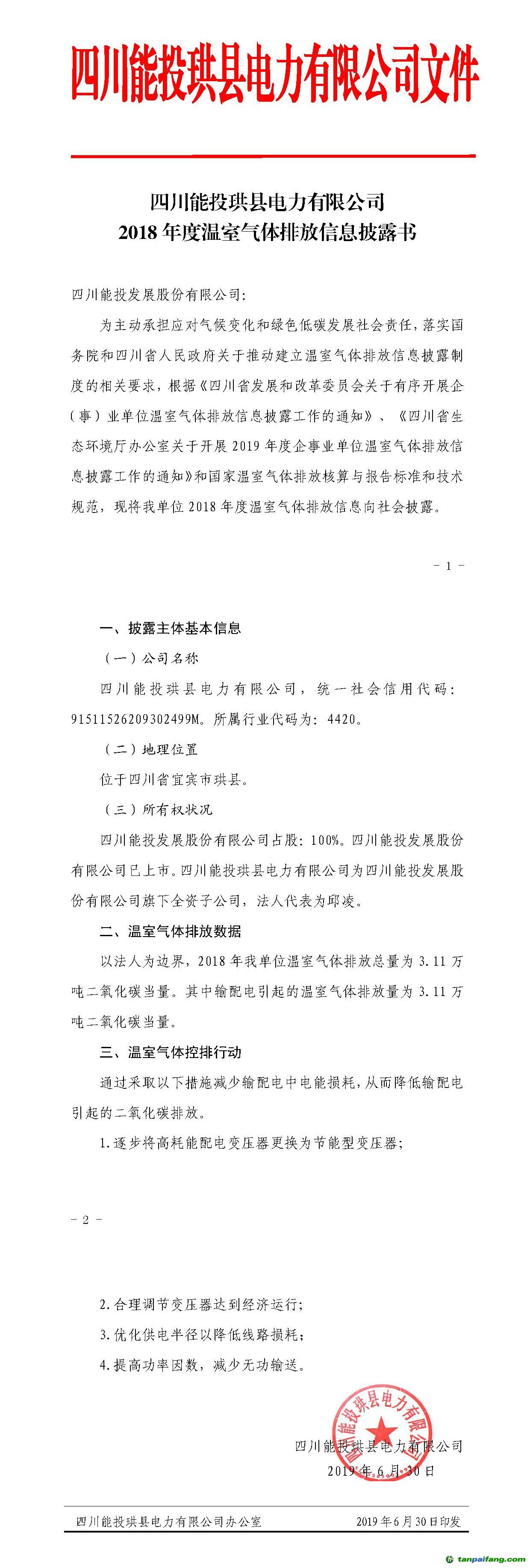 四川能投珙縣電力有限公司于2019年7月10日在其母公司四川能投發(fā)展股份有限公司官網公示了2018年溫室氣體排放信息披露報告,2018 年溫室氣體排放總量為 3.11 萬噸二氧化碳當量。其中輸配電引起的溫室氣體排放量為 3.11 萬噸二氧化碳當量。