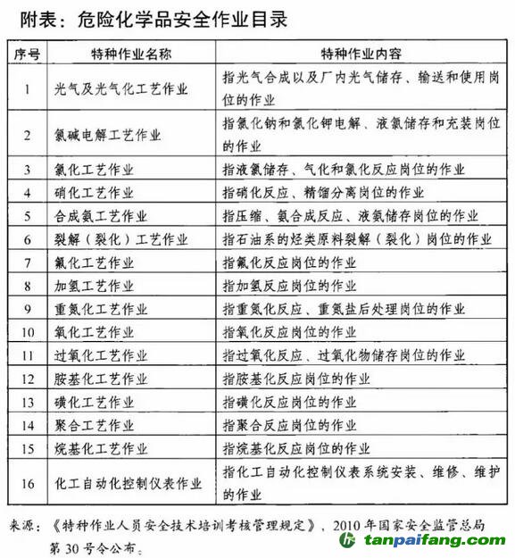 (四)化工企業(yè)從事光氣及光氣化工藝作業(yè)等16種危險化學品安全作業(yè)(見附表)的特種作業(yè)人員需經(jīng)執(zhí)業(yè)能力培訓考核,取得特種作業(yè)操作證后,方可持證上崗。特種作業(yè)人員必須具備高中以上學歷。從事特種設備作業(yè)的人員,必須取得相應特種設備作業(yè)人員資格,方可上崗作業(yè)。