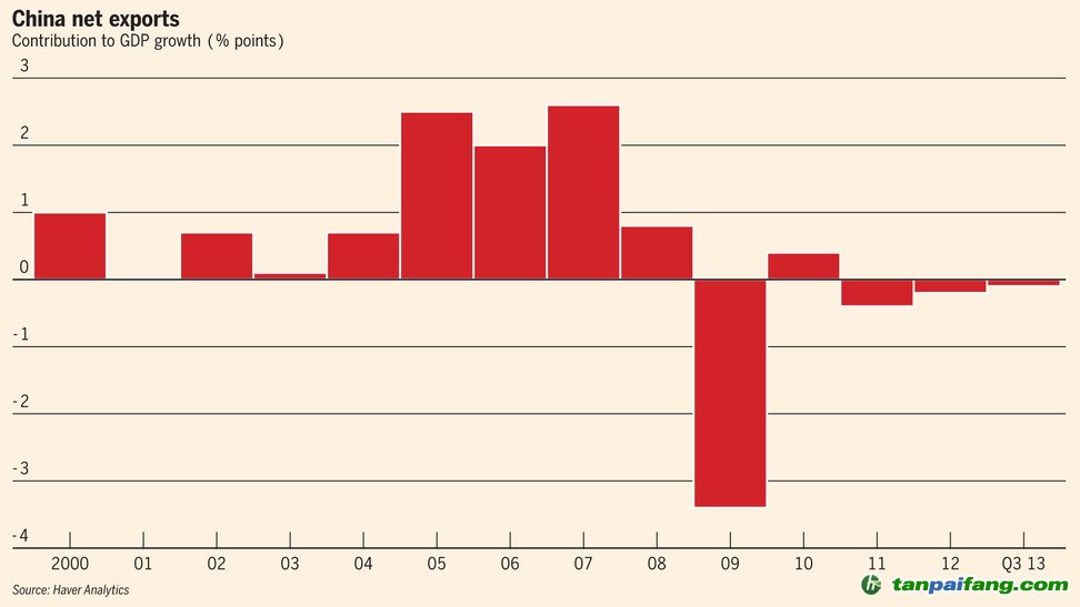 中國(guó)經(jīng)濟(jì)已經(jīng)越來越遠(yuǎn)離“出口拉動(dòng)模式”了。金融危機(jī)前中國(guó)凈出口對(duì)GDP漲幅的貢獻(xiàn)最高達(dá)到2.5%左右,而近三年它已經(jīng)接近零了 本`文@內(nèi)-容-來-自;中^國(guó)_碳0排0放^交-易=網(wǎng) ta n pa i fa ng . co m