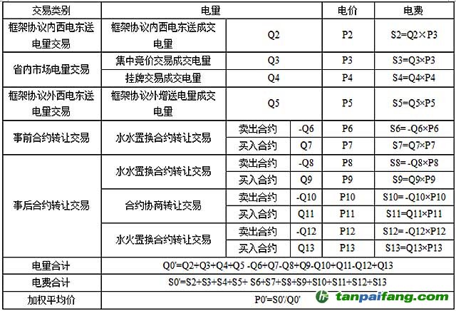 根據(jù)電廠參與的各類省內(nèi)市場電量交易和西電東送電量交易的成交電量和成交價格、各類月度合約轉(zhuǎn)讓交易的成交電量和成交價格,計(jì)算省內(nèi)市場電量交易、西電東送交易、月度合約轉(zhuǎn)讓交易電量的總成交電量Q0'、平均成交電價P0'和總電費(fèi)S0'。 禸嫆@唻洎:狆國湠棑倣茭昜蛧 τāńpāīfāńɡ.cōm