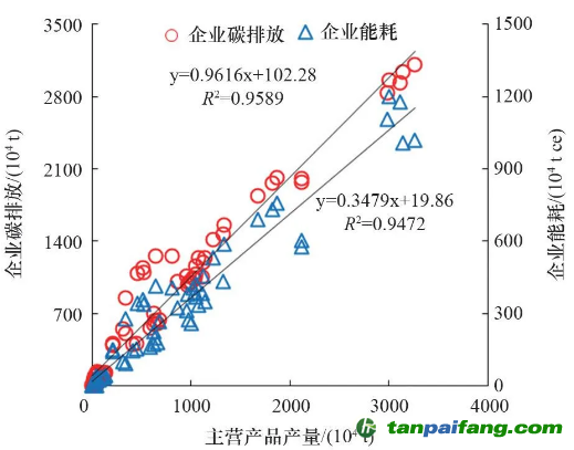 圖3 CO2排放和能耗與主營(yíng)產(chǎn)品產(chǎn)量的關(guān)系 禸嫆@唻洎:狆國(guó)湠棑倣茭昜蛧 τāńpāīfāńɡ.cōm