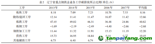 但隨著年份的變化,遼寧省鋼鐵企業(yè)不同工序的碳排放量所發(fā)揮的作用有所改變。2013年煉鐵工序碳排放量最多,其次為供熱工序;2017年則轉(zhuǎn)變?yōu)槠渌o助工序碳排放量最多,其次為煉鐵工序。(表2) 本`文@內(nèi)/容/來(lái)/自:中-國(guó)^碳-排-放^*交*易^網(wǎng)-tan pai fang. com