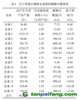 以2017年鋼鐵行業(yè)碳排放量看,遼寧省鋼鐵行業(yè)納管的15家企業(yè)中將會(huì)有9家出現(xiàn)配額盈余,6家出現(xiàn)配額缺口,總的配額表現(xiàn)為盈余。(表4)