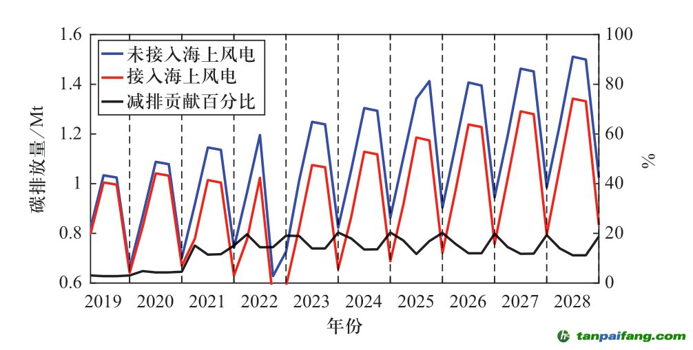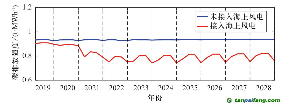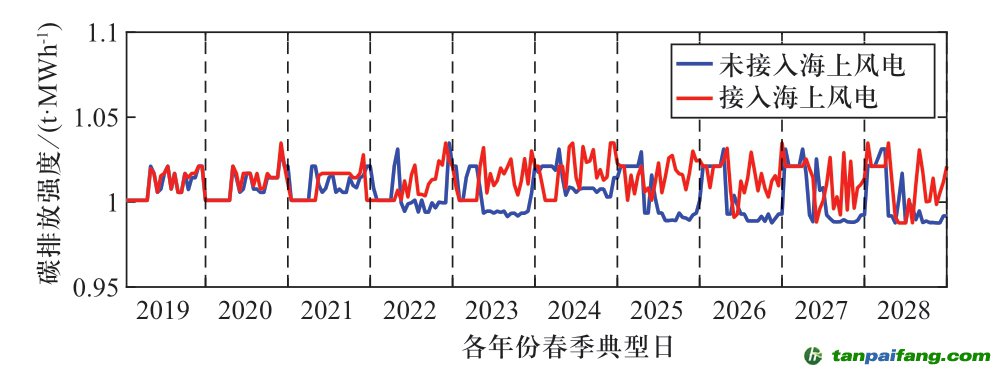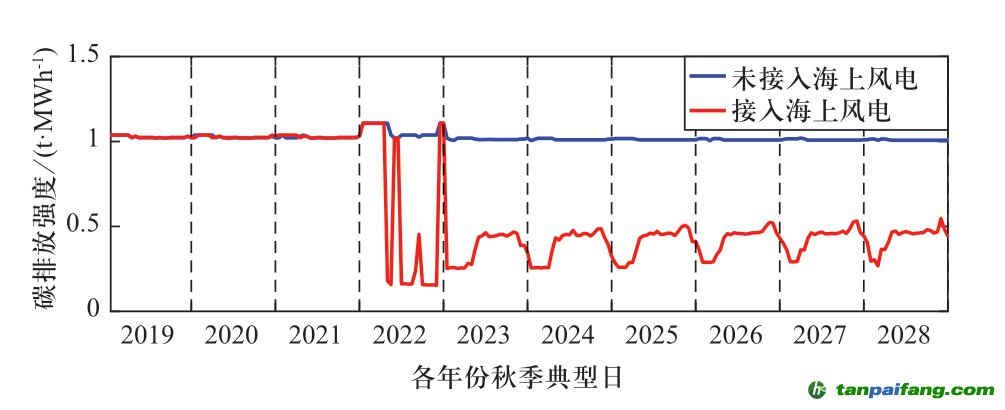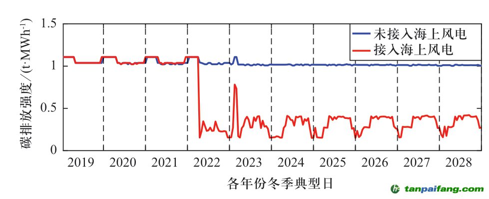 2)未接入海上風(fēng)電時,廣東省系統(tǒng)碳排放強度約0.7~0.8 t/MWh,接入海上風(fēng)電后,系統(tǒng)碳排放強度降低至0.6~0.75 t/MWh。 內(nèi)/容/來/自:中-國-碳-排-放*交…易-網(wǎng)-tan pai fang . com