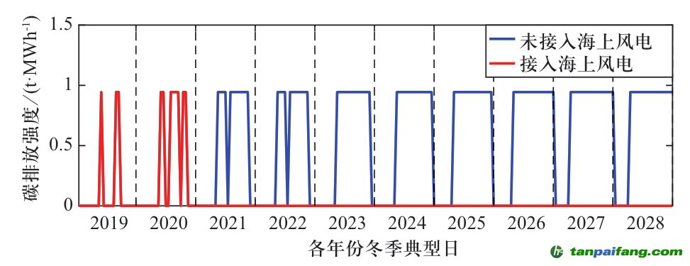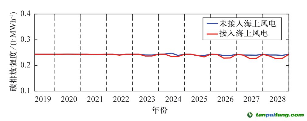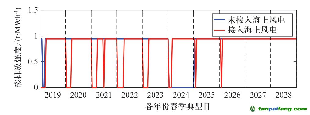 在有海上風(fēng)電情況下,A類機組總碳排放量和系統(tǒng)碳排放強度均基本不變。圖3表示2019—2028年A類機組系統(tǒng)碳排放強度,一小格表示一年春夏秋冬四季。 禸嫆@唻洎:狆國湠棑倣茭昜蛧 τāńpāīfāńɡ.cōm