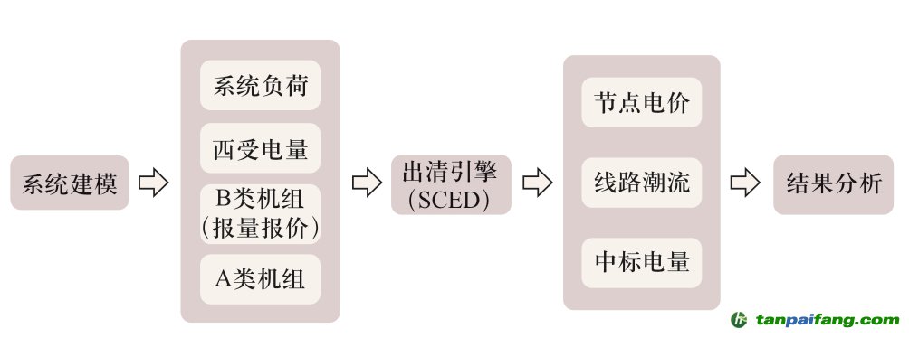 為了評估大規(guī)模海上風(fēng)電對廣東省碳減排的影響,本文以歷史數(shù)據(jù)和以往經(jīng)驗為基礎(chǔ),搭建廣東省電力現(xiàn)貨市場簡化模型,依據(jù)SCED對2019—2028年的現(xiàn)貨市場進行出清仿真,并對仿真結(jié)果進行分析。具體地,輸入系統(tǒng)負荷、西受電量、A類和B類機組 4個變量,分別仿真春、夏、秋、冬各季節(jié)典型日在接入海上風(fēng)電和未接入海上風(fēng)電兩種情況下的A、B類機組出力,依據(jù)不同機組碳排放系數(shù),計算并分析系統(tǒng)及各節(jié)點碳排放量和碳排放強度。圖1表示電力現(xiàn)貨市場的仿真流程。 本文+內(nèi)-容-來-自;中^國_碳+排.放_交^易=網(wǎng) t a n pa ifa ng .c om