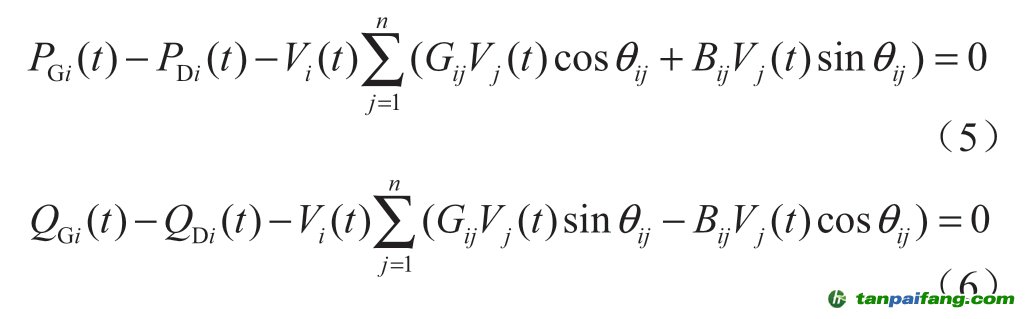 式中:PDi(t)和QDi(t)分別為節(jié)點i在時間t的有功負荷和無功負荷;Gij、Bij、θij分別為節(jié)點i和節(jié)點j間的電導(dǎo)、電納、相位角;Vi(t)和Vj(t)分別為節(jié)點i和節(jié)點 j在時間t的電壓。 禸嫆@唻洎:狆國湠棑倣茭昜蛧 τāńpāīfāńɡ.cōm
