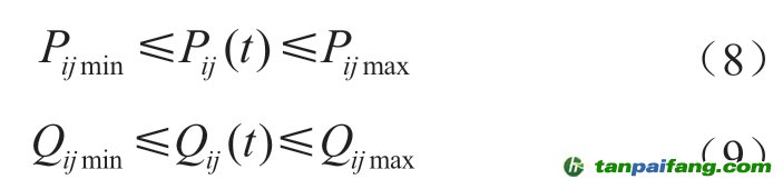 式中:Pijmin和Pijmax分別為節(jié)點i和節(jié)點 j間輸電線路潮流有功功率的下限和上限;Qijmin和Qijmax分別為節(jié)點i和節(jié)點j間輸電線路潮流無功功率的下限和上限;Pij(t)和Qij(t)為節(jié)點i和節(jié)點 j間輸電線路的實際潮流有功功率和無功功率。 夲呅內(nèi)傛萊源?。骇鎲┨?排*放^鮫*易-網(wǎng) τā ńpāīfāńɡ.cōm