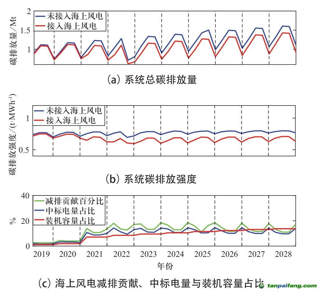 在有海上風(fēng)電情況下,廣東省電力系統(tǒng)總碳排放量及碳排放強度變化明顯。圖2表示廣東省2019—2028系統(tǒng)總碳排放量、系統(tǒng)碳排放強度、海上風(fēng)電減排貢獻百分比、中標(biāo)電量占比及裝機容量占比,一小格表示一年春夏秋冬四季。 本%文$內(nèi)-容-來-自;中_國_碳|排 放_交-易^網(wǎng)^t an pa i fang . c om