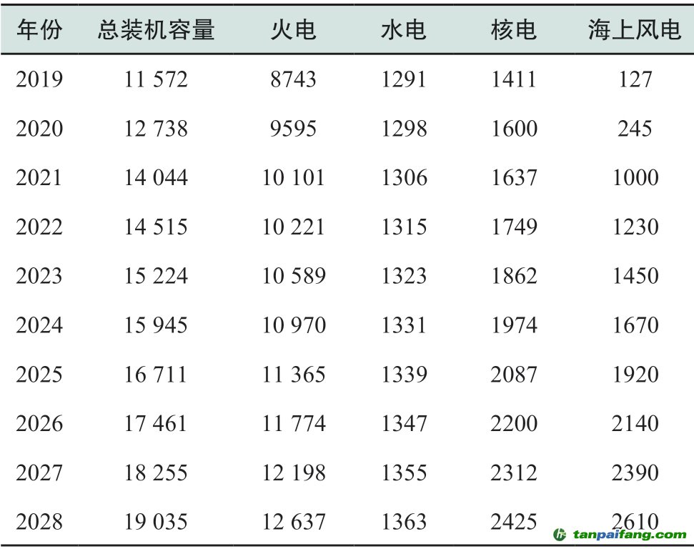 表2 2019—2028年廣東省各類型機組裝機容量預(yù)測