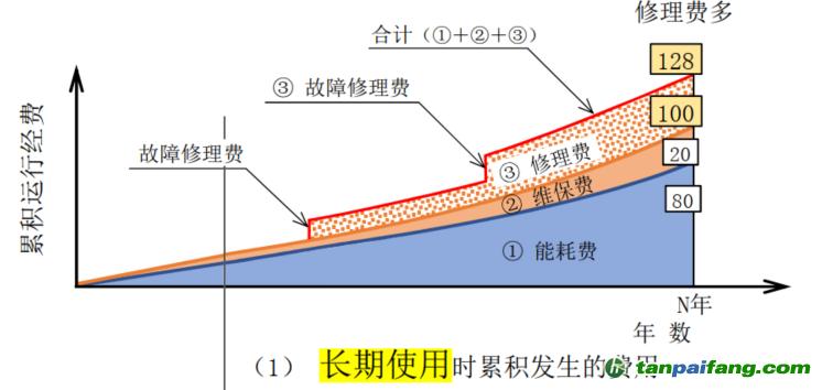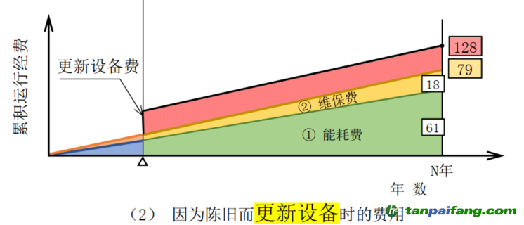 當(dāng)涉及長期使用設(shè)備的節(jié)能時(shí),需要對“長期使用”與“更換設(shè)備”兩個(gè)選項(xiàng)進(jìn)行全面的對比衡量。一般來說,如果維持長期使用,能耗費(fèi)和維保費(fèi)都會(huì)呈上升趨勢,還可能會(huì)發(fā)生無法預(yù)測的故障。更新設(shè)備后由于效率提高,能耗費(fèi)和維保費(fèi)都會(huì)明顯下降,也不容易發(fā)生故障,但是更新設(shè)備會(huì)產(chǎn)生一筆大的費(fèi)用,因此需要對比兩種方式在同一時(shí)間點(diǎn)的累積費(fèi)用,對投資回收期的判斷不是簡單的收回設(shè)備投資成本,而是“更換設(shè)備”的總成本到哪一年會(huì)小于“長期使用”的總成本,如果小于3年則建議更新,3-5年內(nèi)也可考慮更新,超過5年如果能獲得補(bǔ)貼也可建議實(shí)施,體現(xiàn)了一種全生命周期、全要素的評估方式。