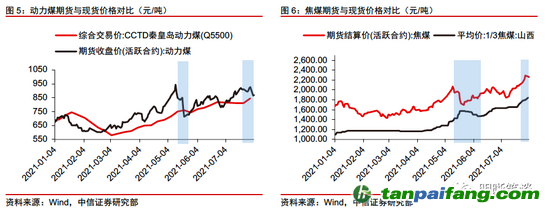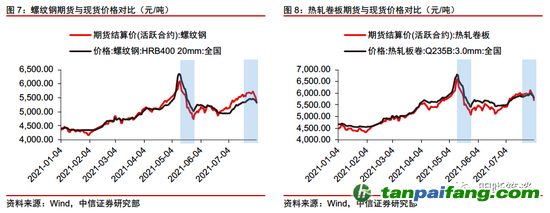 分析現(xiàn)貨和期貨兩個市場的價格走勢,其中煤炭價格分化顯著,或表明期貨市場投機性活動增多,而鋼材價格在兩個市場的走勢較為一致。對比煤炭現(xiàn)期貨市場價格走勢,有兩個時間段值得注意:(1)2021年5月,國常會自5月以來多次提及大宗商品漲價以及保供穩(wěn)價,煤炭及鋼材的期貨、現(xiàn)貨市場均出現(xiàn)回調,其中動力煤和焦煤的期貨和現(xiàn)貨價格回調幅度分化顯著,期貨市場價格降幅明顯,而現(xiàn)貨市場價格回調幅度有限;(2)2021年7月30日及之后,政治局會議提及“減碳”相關內容后,市場對于限產預期有所松動,多個大宗商品期貨價格下跌,投機性資金被震出,期市多頭情緒有所降溫。煤炭現(xiàn)貨市場維持韌性,供需缺口存在下未出現(xiàn)明顯回落。 本*文@內-容-來-自;中_國_碳^排-放*交-易^網(wǎng) t an pa i fa ng . c om